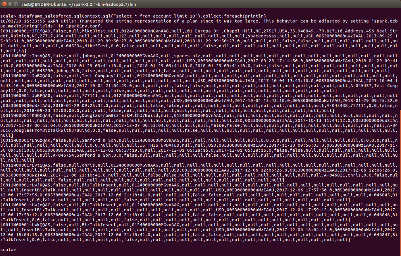 scala> github_df.sqlContext.sql("SELECT Name, Email FROM Users WHERE UserLogin = mojombo").collect.foreach(println)You will see the results displayed in the console, similar to the following: