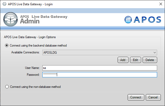 - In the APOS Live Data Gateway On the Connection tab, configure the connection: