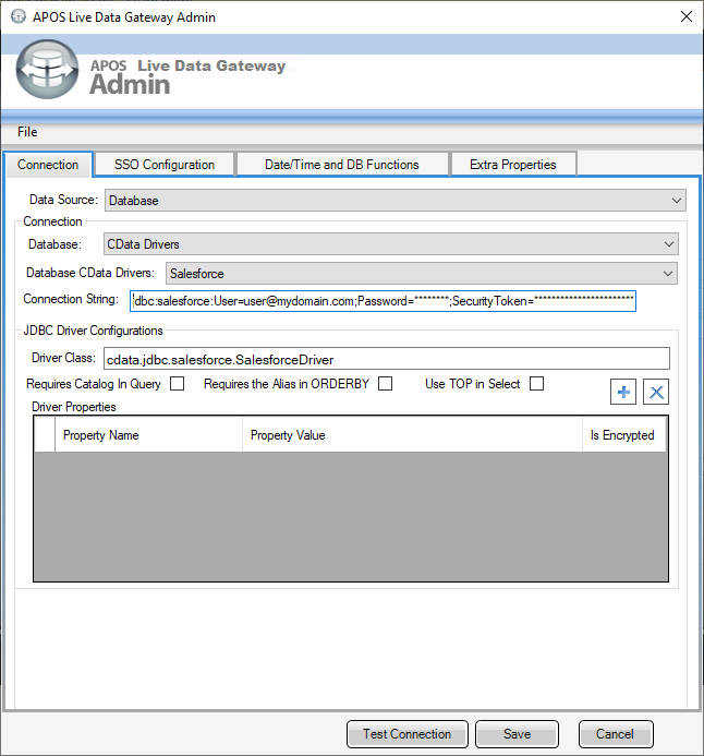 Before establishing the connection to GitHub from the APOS Live Data Gateway, you need to configure the GitHub JDBC Connection String.