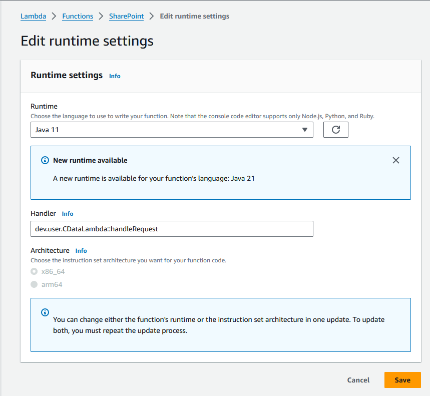 - In the "Runtime settings" section, click "Edit" and set Handler to your "handleRequest" method (e.g. package.class::handleRequest)