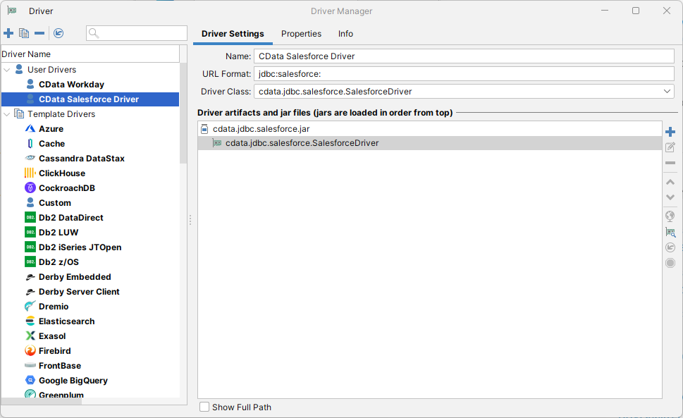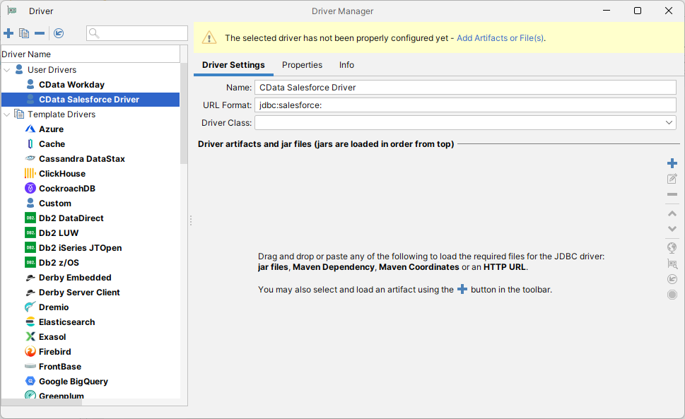 - In Driver artifacts and jar files (jars are loaded in order from top):