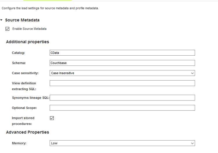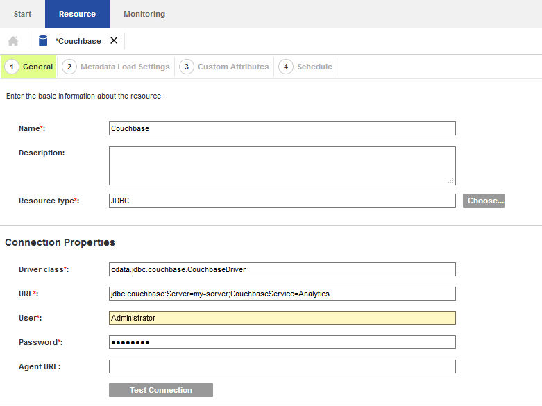 - Schema: Set this to the appropriate schema for multi-schema data sources. Otherwise, set this to the name of the service (for example, Couchbase).