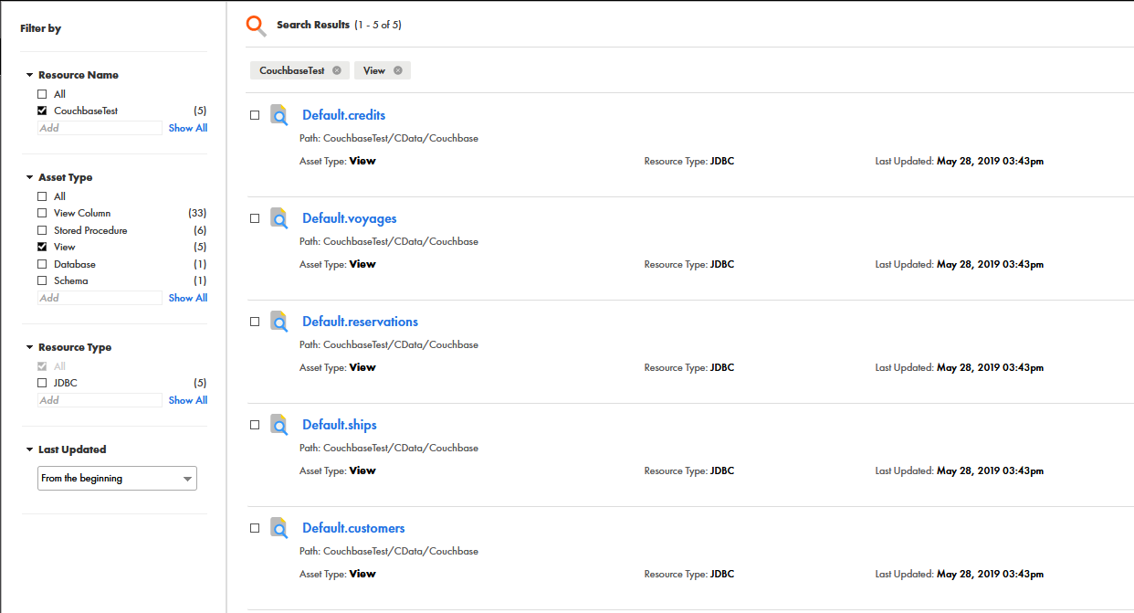 Open the Catalog Service browser to view the metadata extracted from the data source. Depending upon the options you selected when configuring the metadata scanner, you may see any combination of tables, views, and stored procedures for the resource you defined.