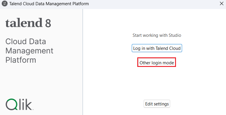 - Run the Talend Cloud Data Management Platform installed on your local system and click on Other Login Mode.