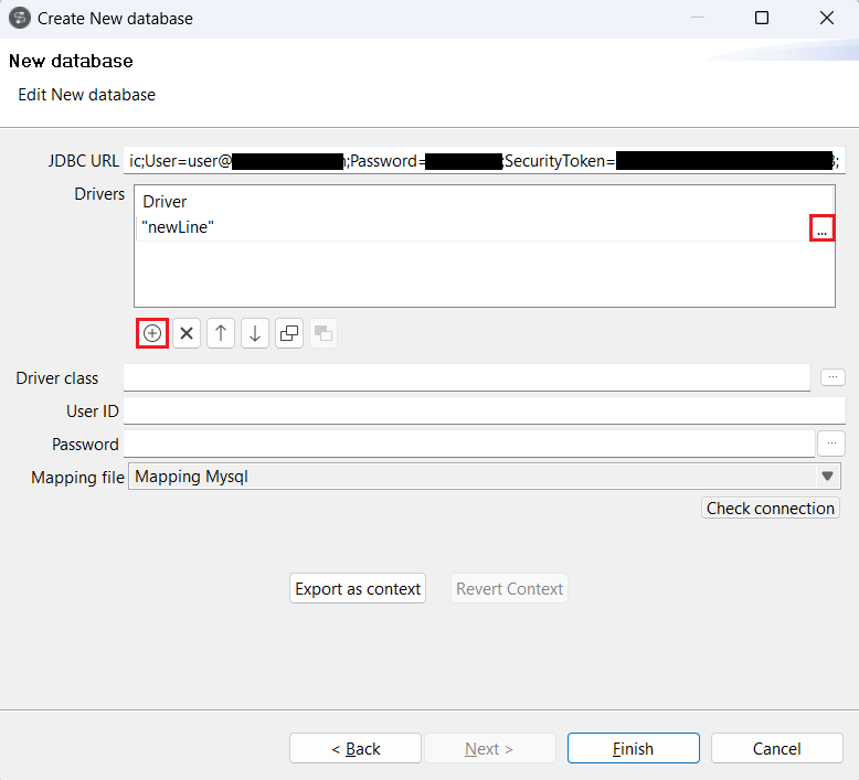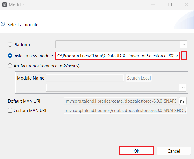 - Click on the "(+) Add" button under Drivers. A 'newLine' will appear in the Drivers board. Click on (...) at the end of the new line, select the Install a new module radio button, and click on (...) to add the path to the JAR file, located in the 'lib' subfolder of the installation directory. Click on OK.