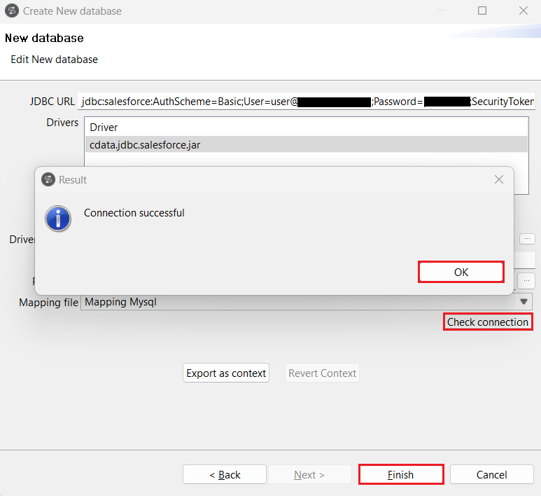 - Click on Check Connection. If the entered details are correct, a "Connection successful" confirmation prompt will appear. Click on "OK" and "Finish".