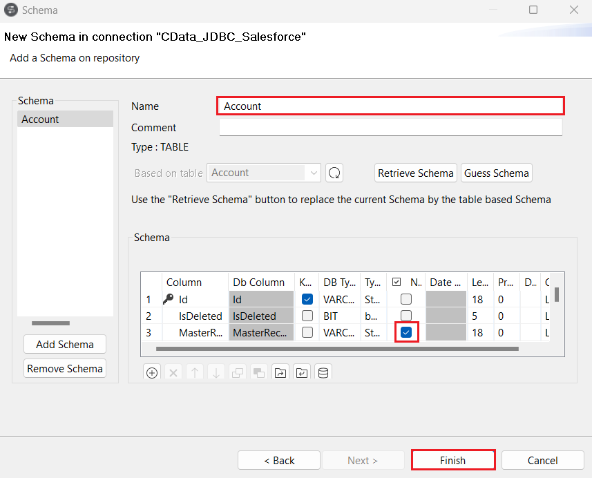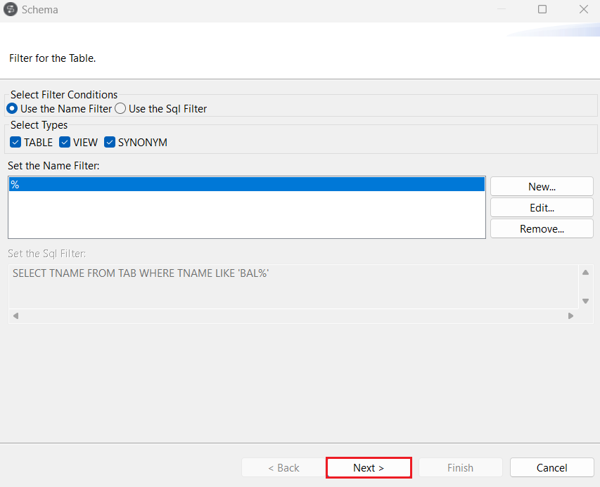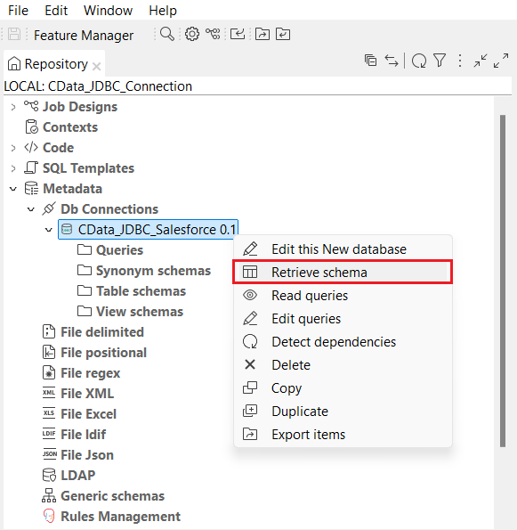 - Once the connection is established, right-click on the newly created connection and select Retrieve Schema. You can use the filters as well to retrieve the data as per your requirements. Click on Next.