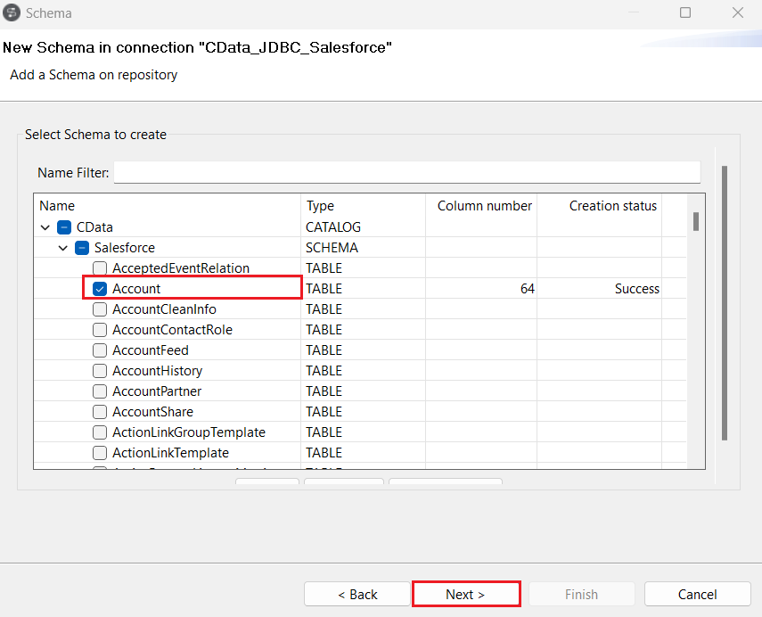 - Expand the "CData" catalog in the Schema window and select the tables you want to import from the GitHub schema. Click on Next.