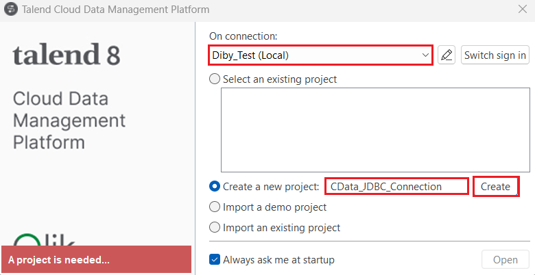 - Now, select the Create a new project radio button to add a new project name and click on Create.
