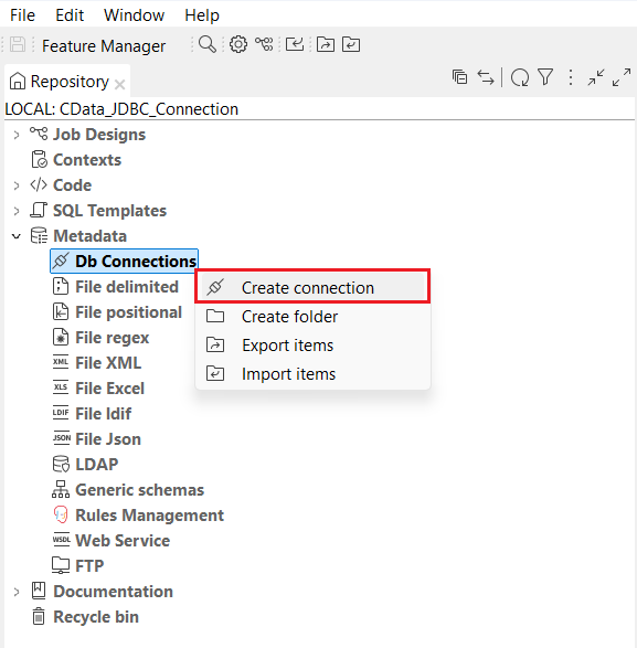- In the navigation pane, locate and expand the Metadata dropdown. Right-click on Db Connections and select Create Connection.