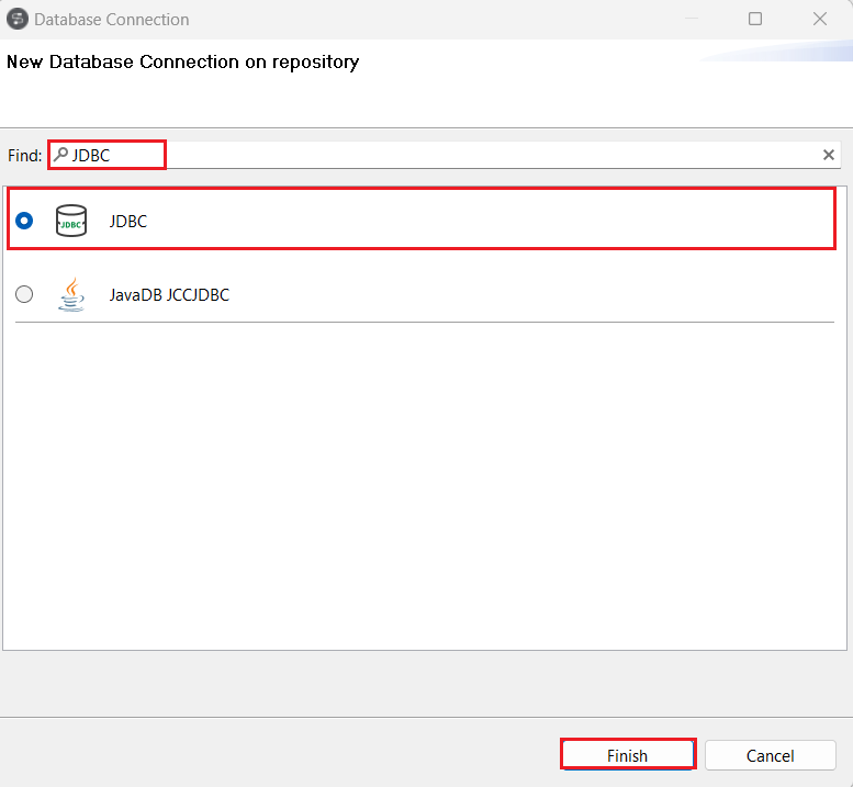 - Search for and select 'JDBC' in the Find section of the Database Connection window. Then, click on Finish.