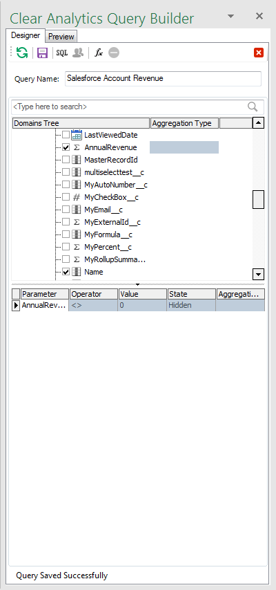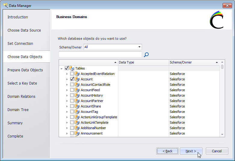 - Select the Schema/Owner and choose the domains (tables) that you wish to use in Clear Analytics.