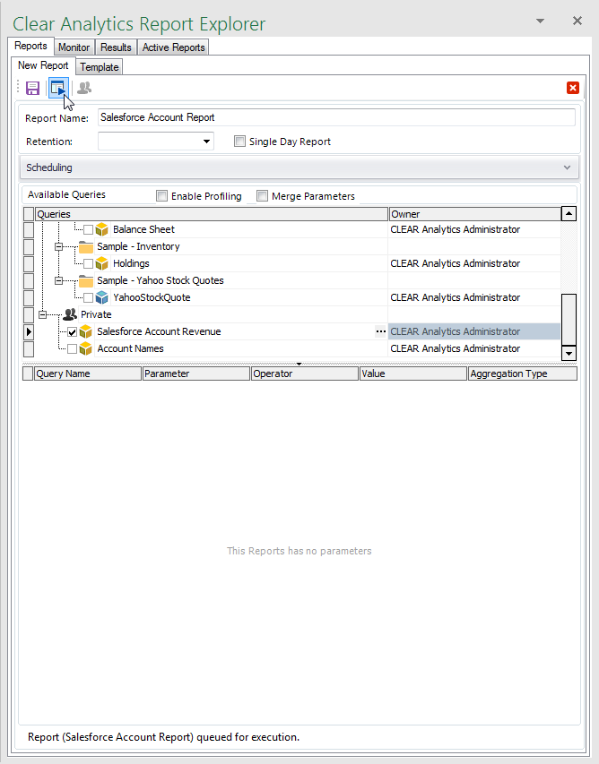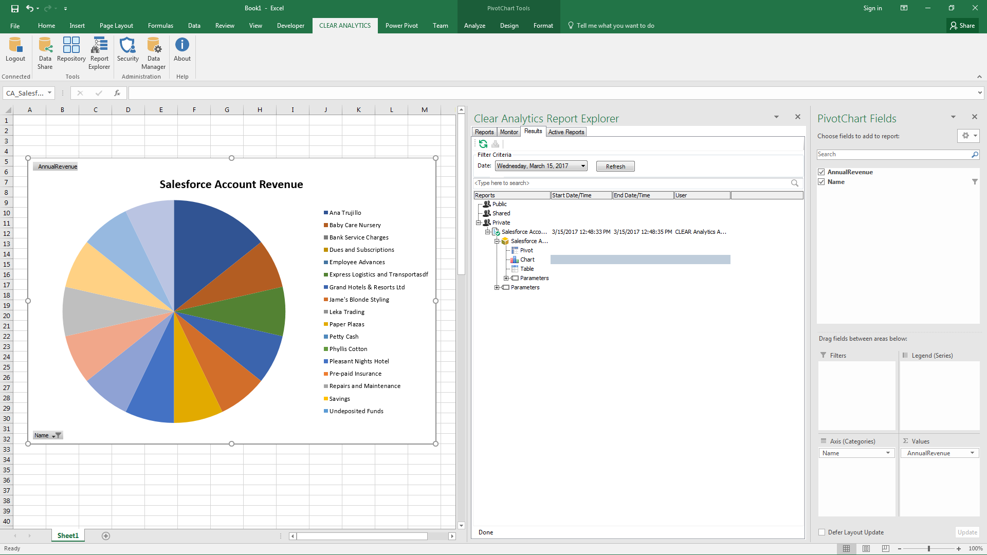 With the query created, you are now ready to execute a report and display a chart.- Click Report Explorer in the CLEAR ANALYTICS ribbon.