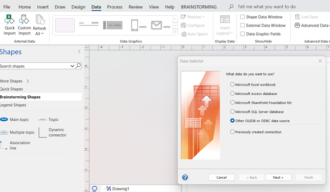 - On the Data tab, click Custom Import and select Other OLEDB or ODBC data source.