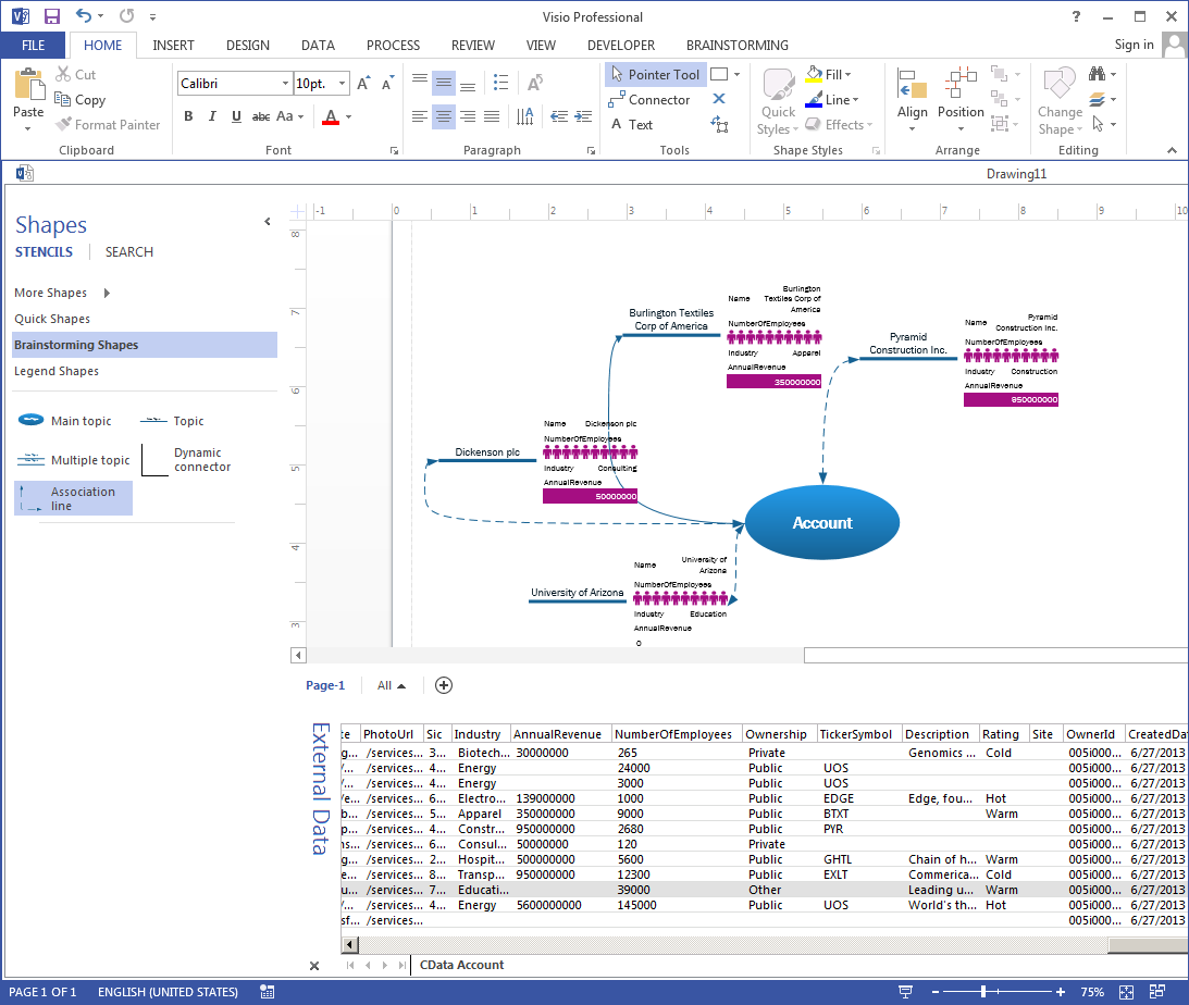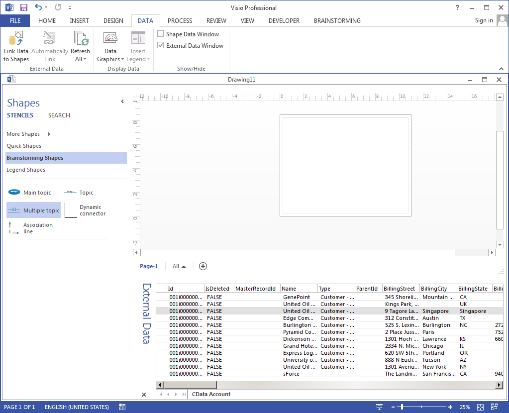 - Select a row in the External Data window and drag it onto the drawing page.