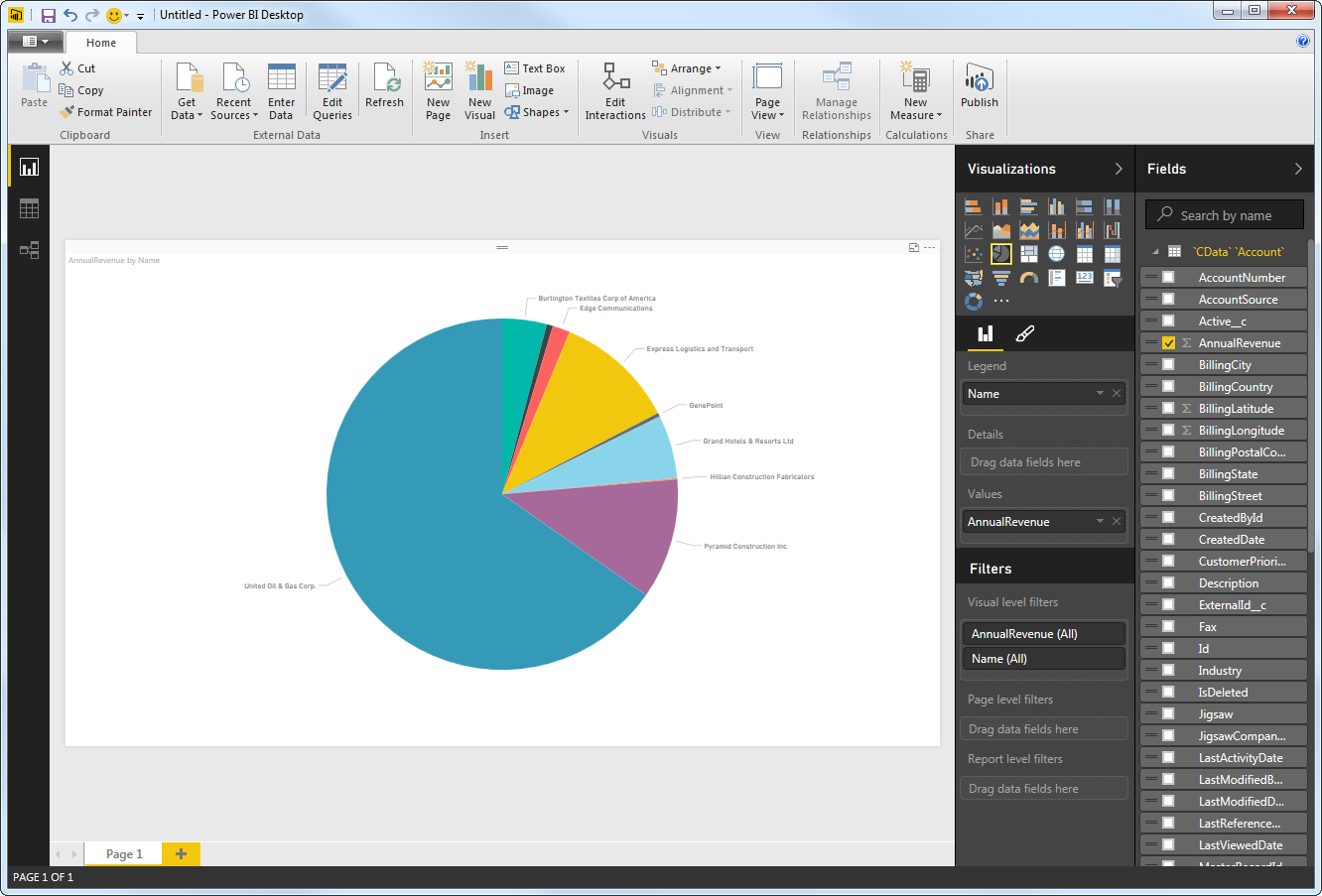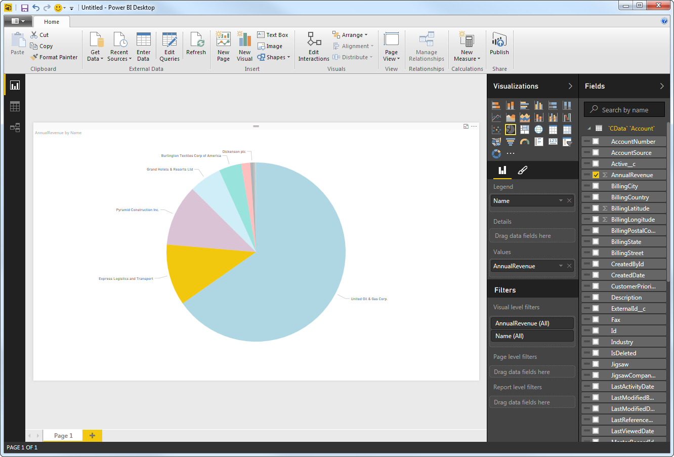 After pulling the data into Power BI, you can create data visualizations in the Report view by dragging fields from the Fields pane onto the canvas. Follow the steps below to create a pie chart: