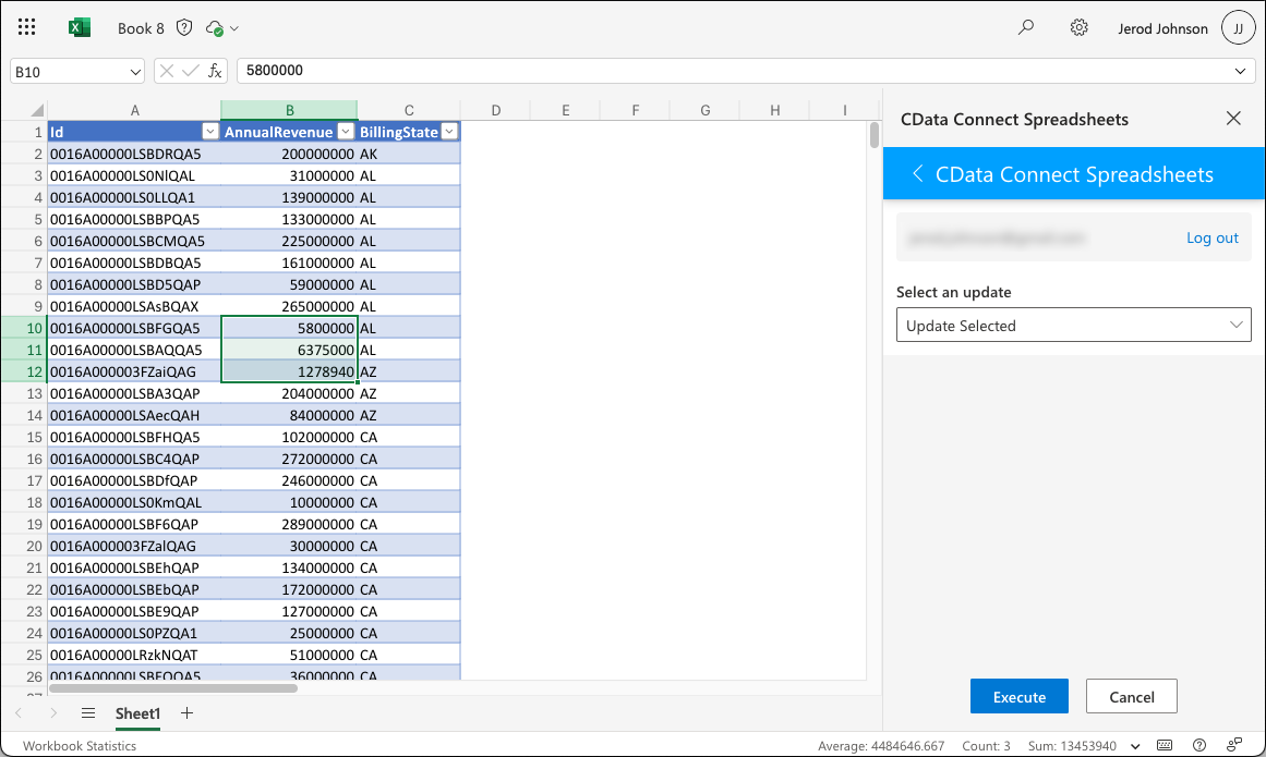 - In the Connect Spreadsheets Add-In panel, select Update
