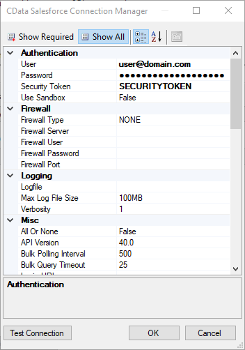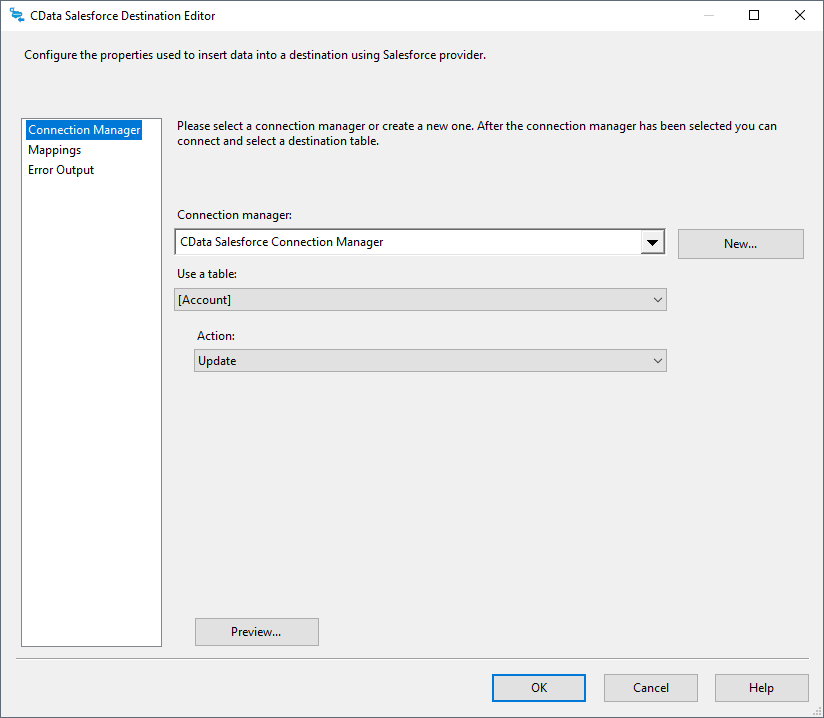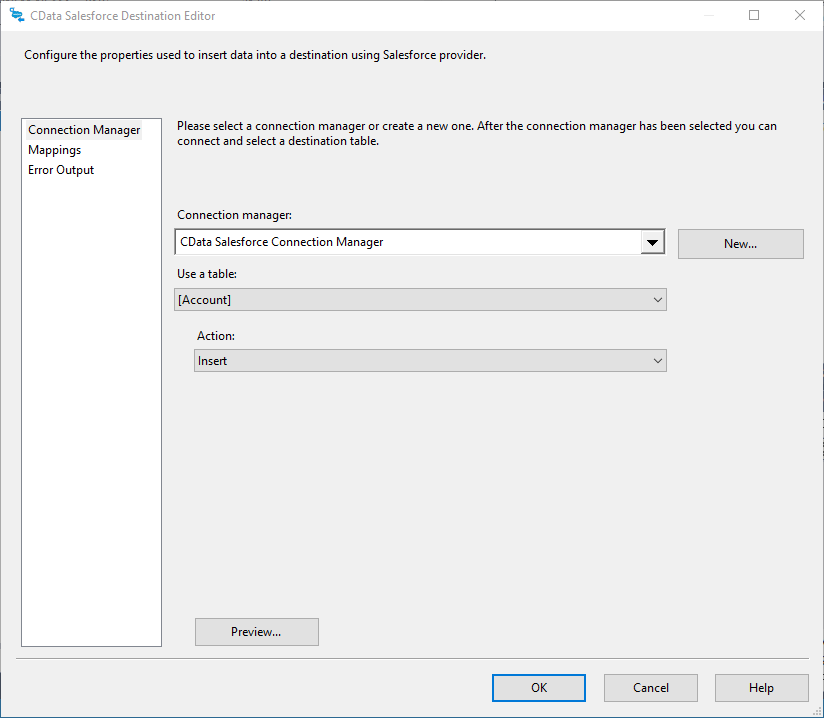 - On the Connection tab, specify the Connection manager (or create a new one) and the table into which the data will be upserted. In this case, you will transfer Account records.