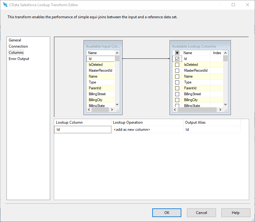 - On the Columns tab, configure the mapping of the primary key from the input columns to the primary key of the lookup columns.