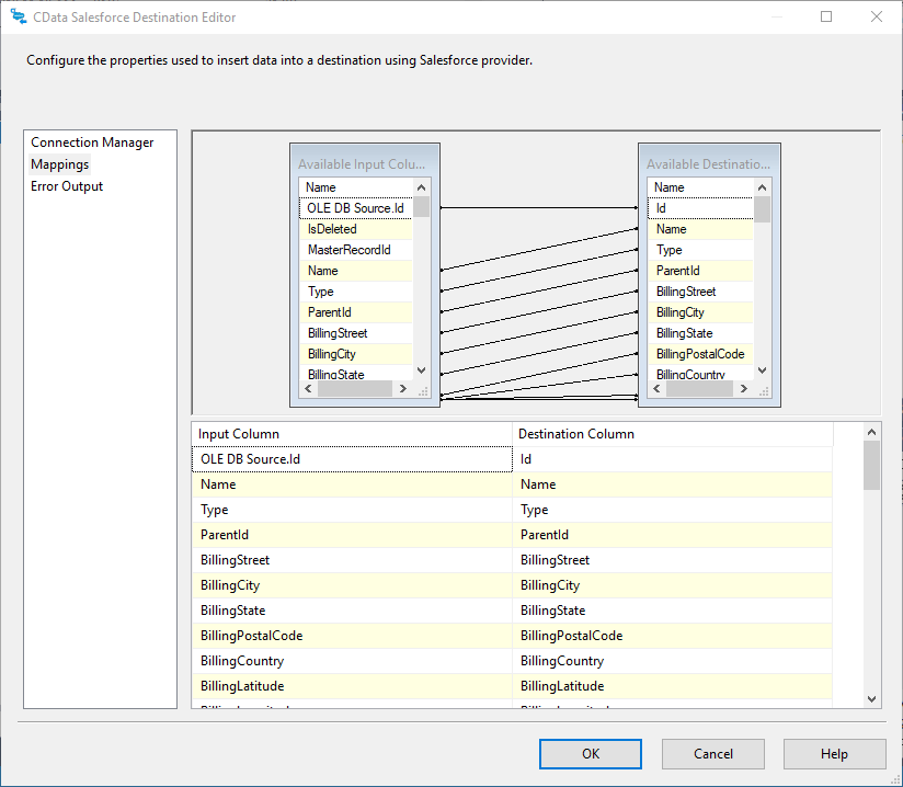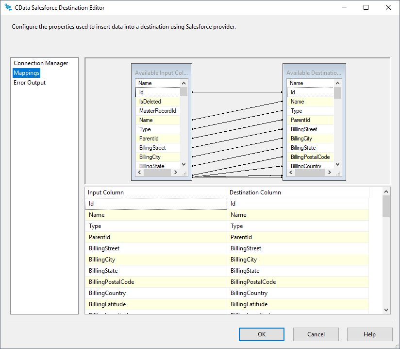 - On the Column Mappings tab, configure the mappings from the input columns to the destination columns.