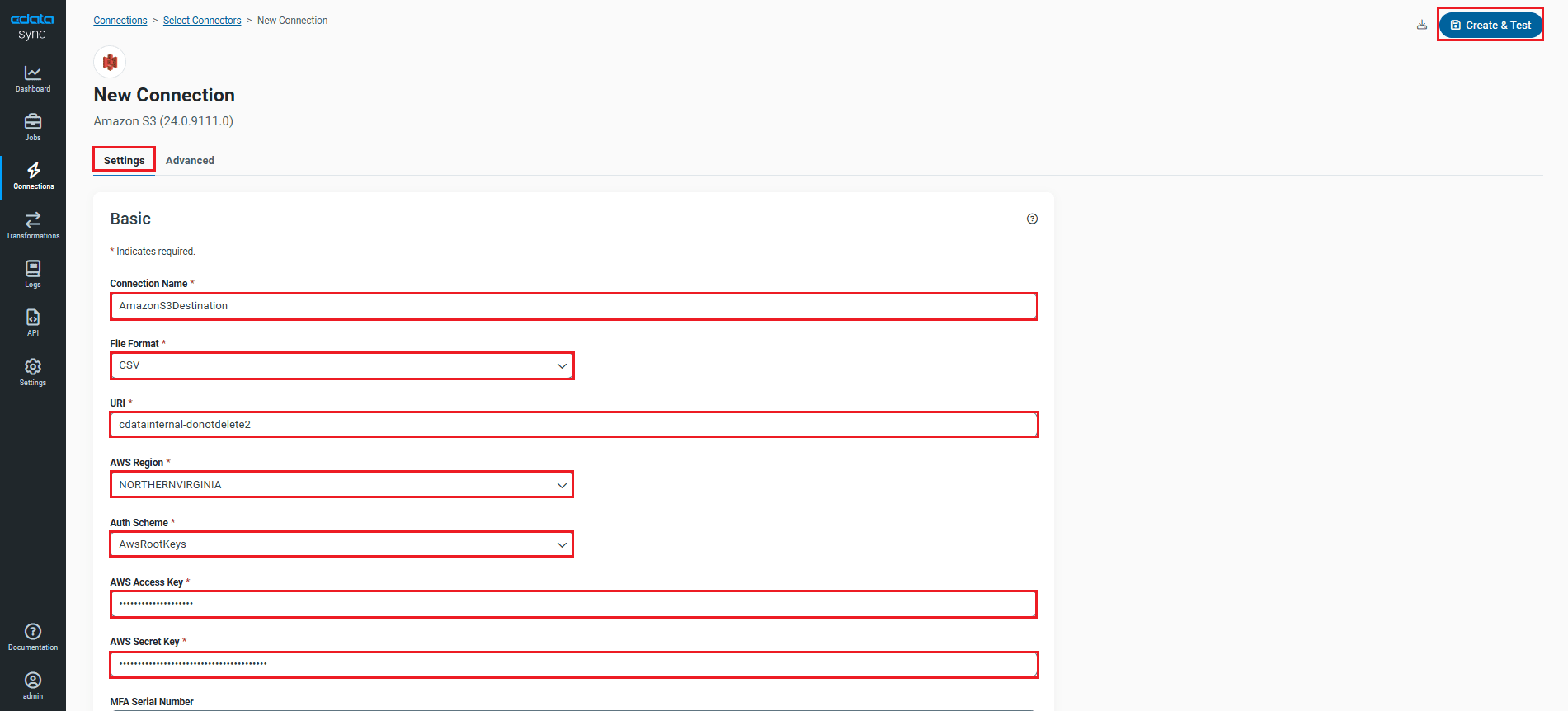 - Once connected, click Create & Test to create, test and save the connection.