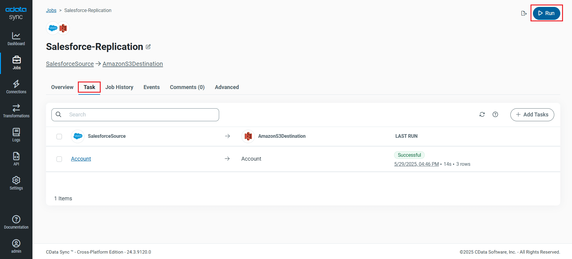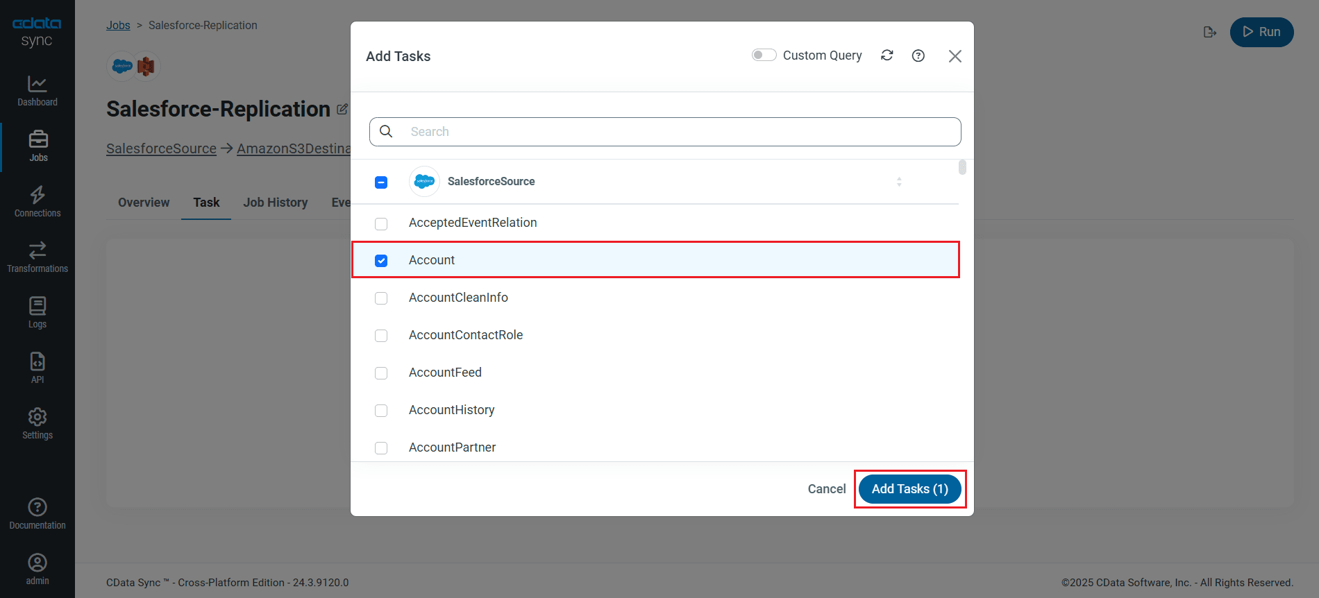 To replicate an entire table, navigate to the Task tab in the Job, click Add Tasks, choose the table(s) from the list of GitHub tables you wish to replicate into Amazon S3, and click Add Tasks again.