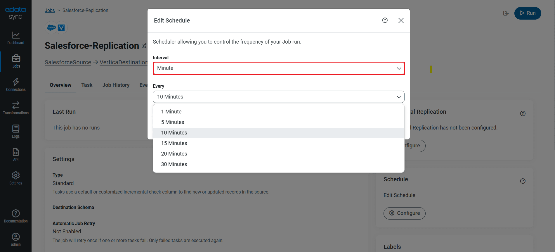 Select the Overview tab in the Job, and click Configure under Schedule. You can schedule a job to run automatically by configuring it to run at specified intervals, ranging from once every 10 minutes to once every month.