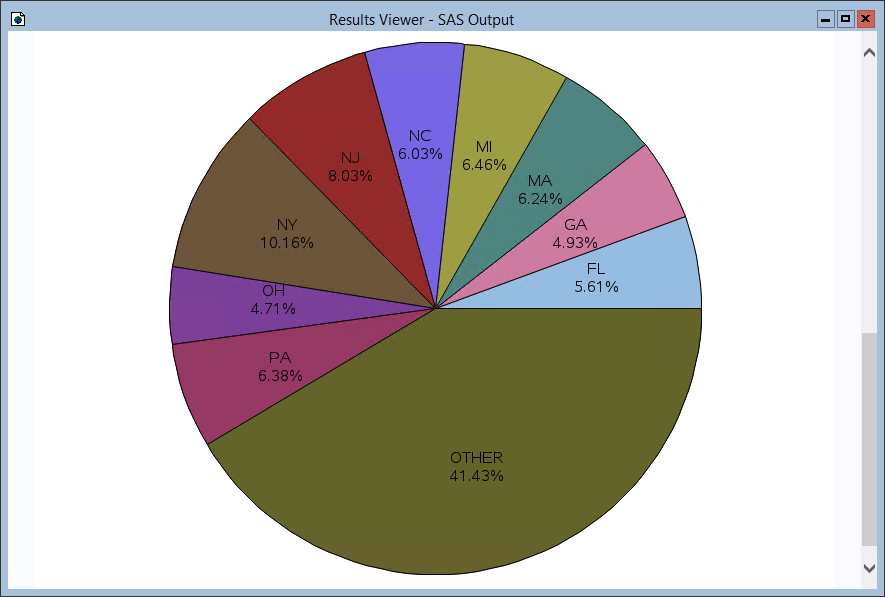 proc gchart data=buckets; pie name / sumvar=ownerid value=arrow percent=arrow noheading percent=inside plabel=(height=12pt) slice=inside value=none name='BucketsChart'; run;