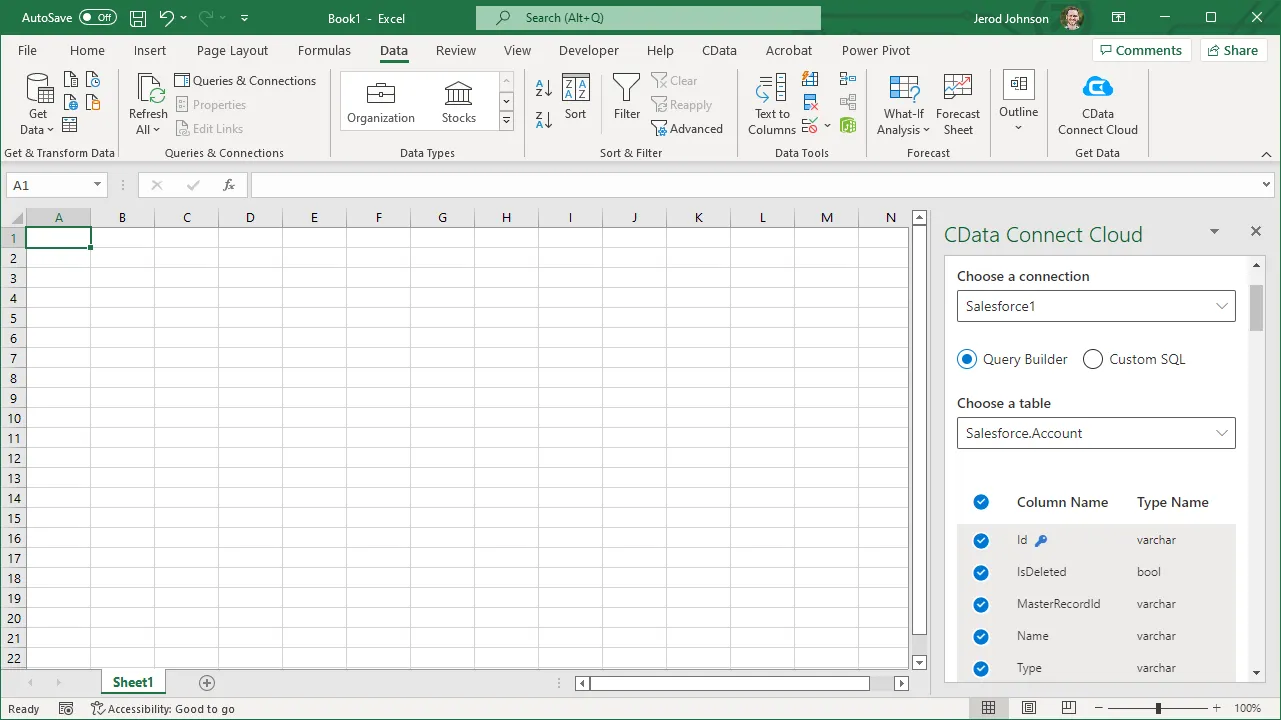 This setup requires a CData Connect Cloud instance and the CData Connect Cloud Add-In for Excel. To get started, sign up a free trial of Connect Cloud and install the free Connect Cloud Excel Add-In.