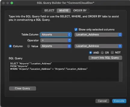- Open the "WHERE" tab of the SQL Query Builder and select "Show only selected columns."