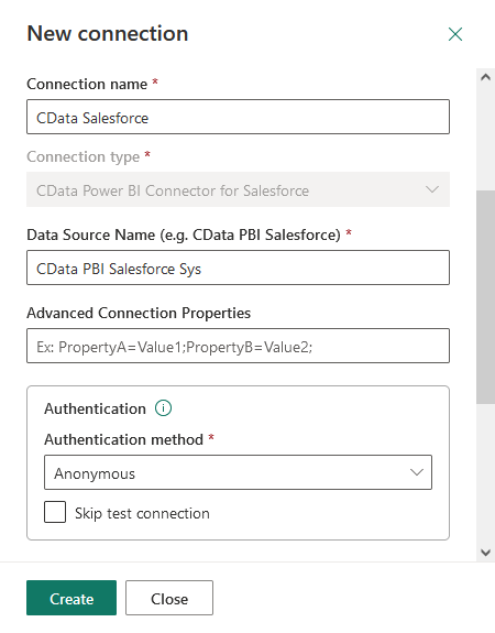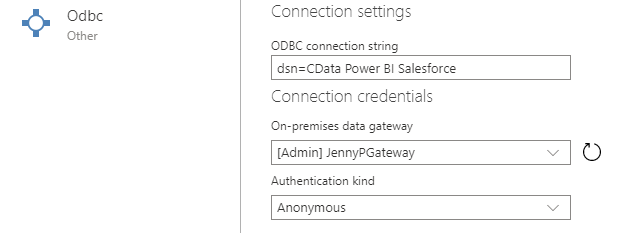 Enter your DSN name in the ODBC connection string section, dsn=CData Power BI MongoDB. Choose your gateway and set the authentication type to Anonymous.