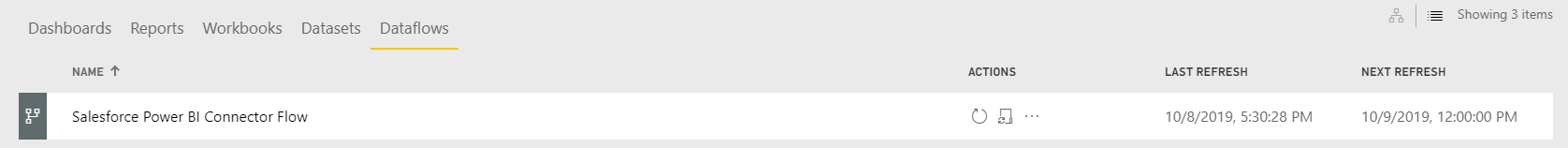 - To refresh manually, open the dataflow options menu from your workspace -> Dataflows and click Refresh Now.