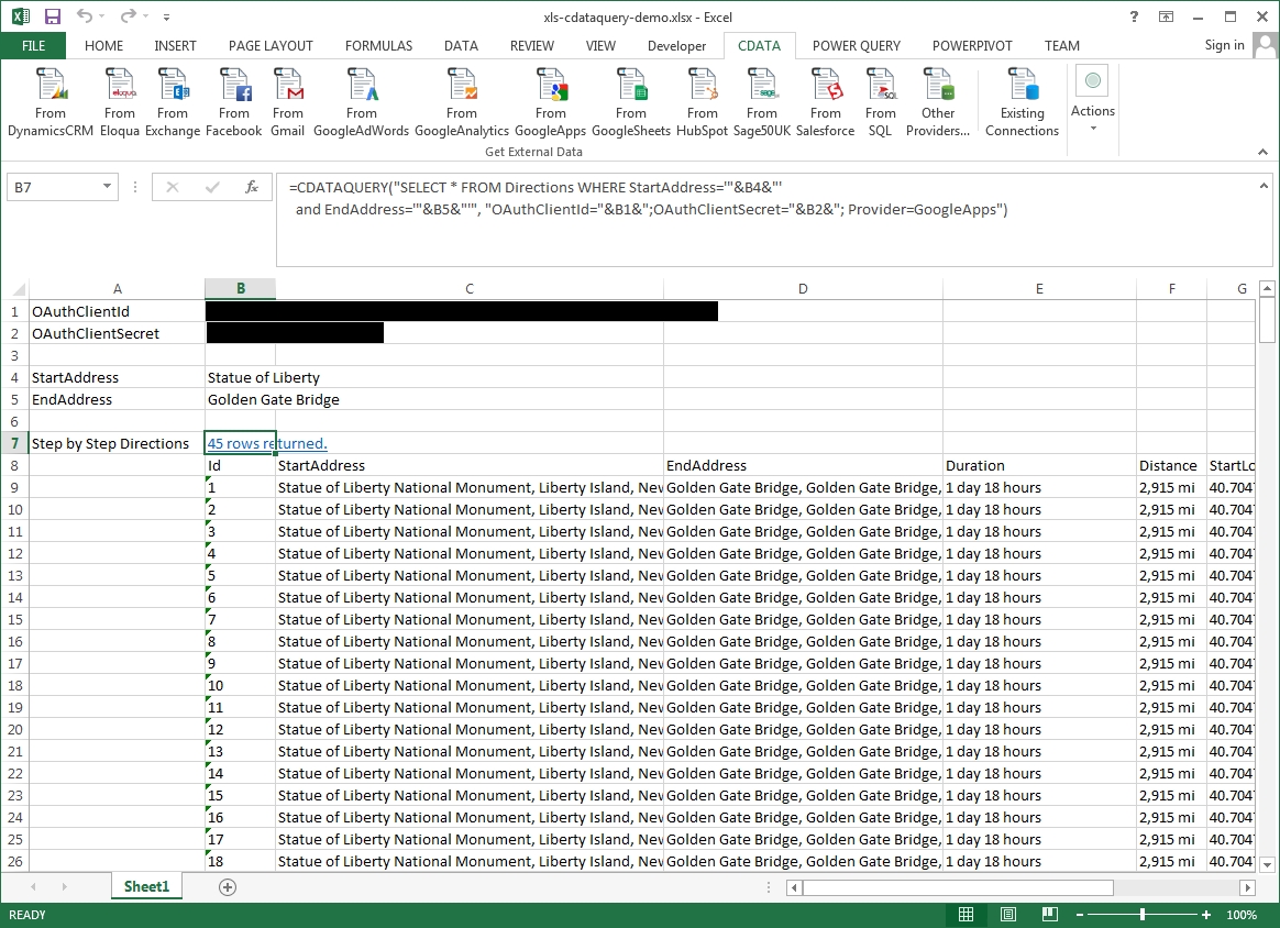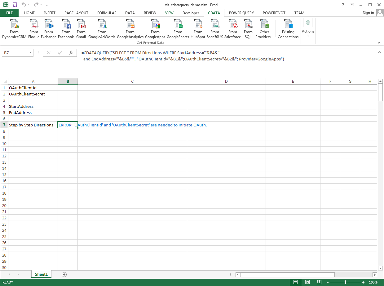 =CDATAQUERY(Query, [Connection], [Parameters], [ResultLocation]);