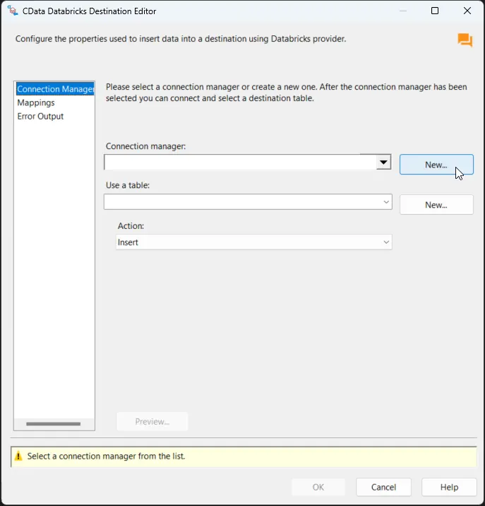 Double-click the CData Databricks Destination to open the destination component editor and add a new connection.