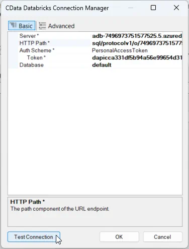 In the CData Databricks Connection Manager, configure the connection properties, then test and save the connection. To connect to a Databricks cluster, set the properties as described below.