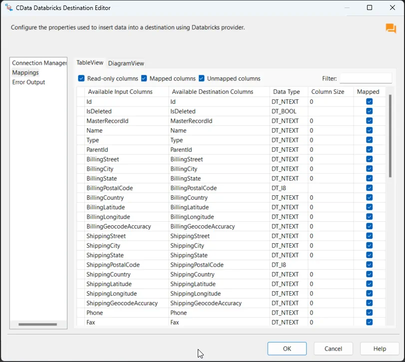 With the Microsoft Project Source configured, we can configure the Databricks connection and map the columns.