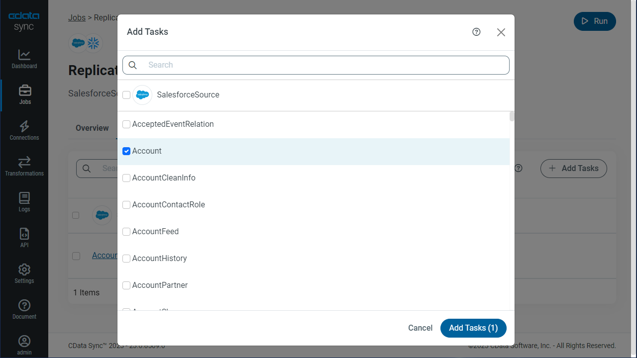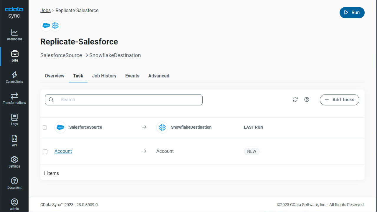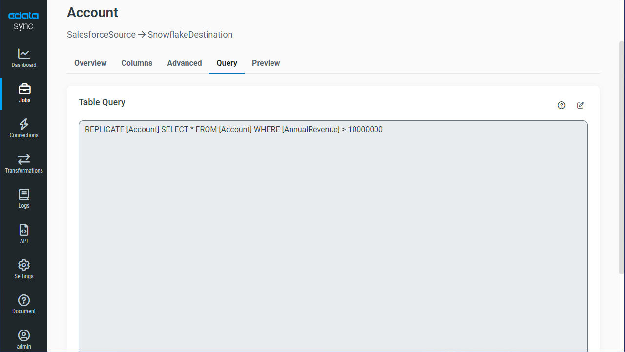 CData Sync enables you to control replication with a point-and-click interface and with SQL queries. For each replication you wish to configure, navigate to the Jobs tab and click Add Job. Select the Source and Destination for your replication.