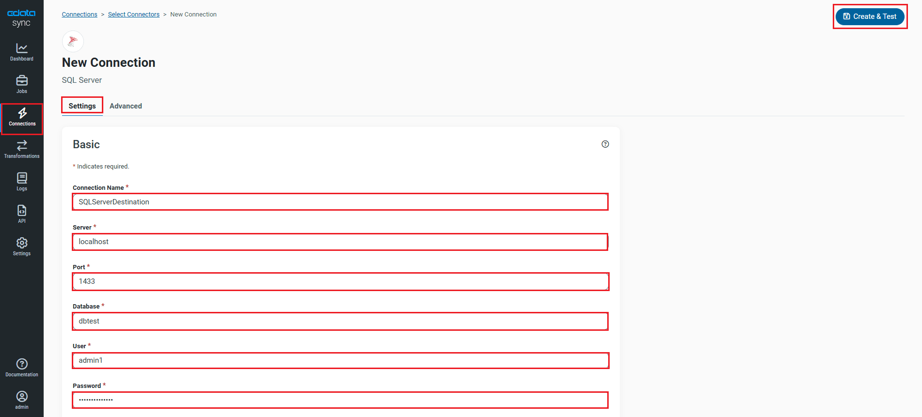 - Once connected, click Create & Test to create, test and save the connection.