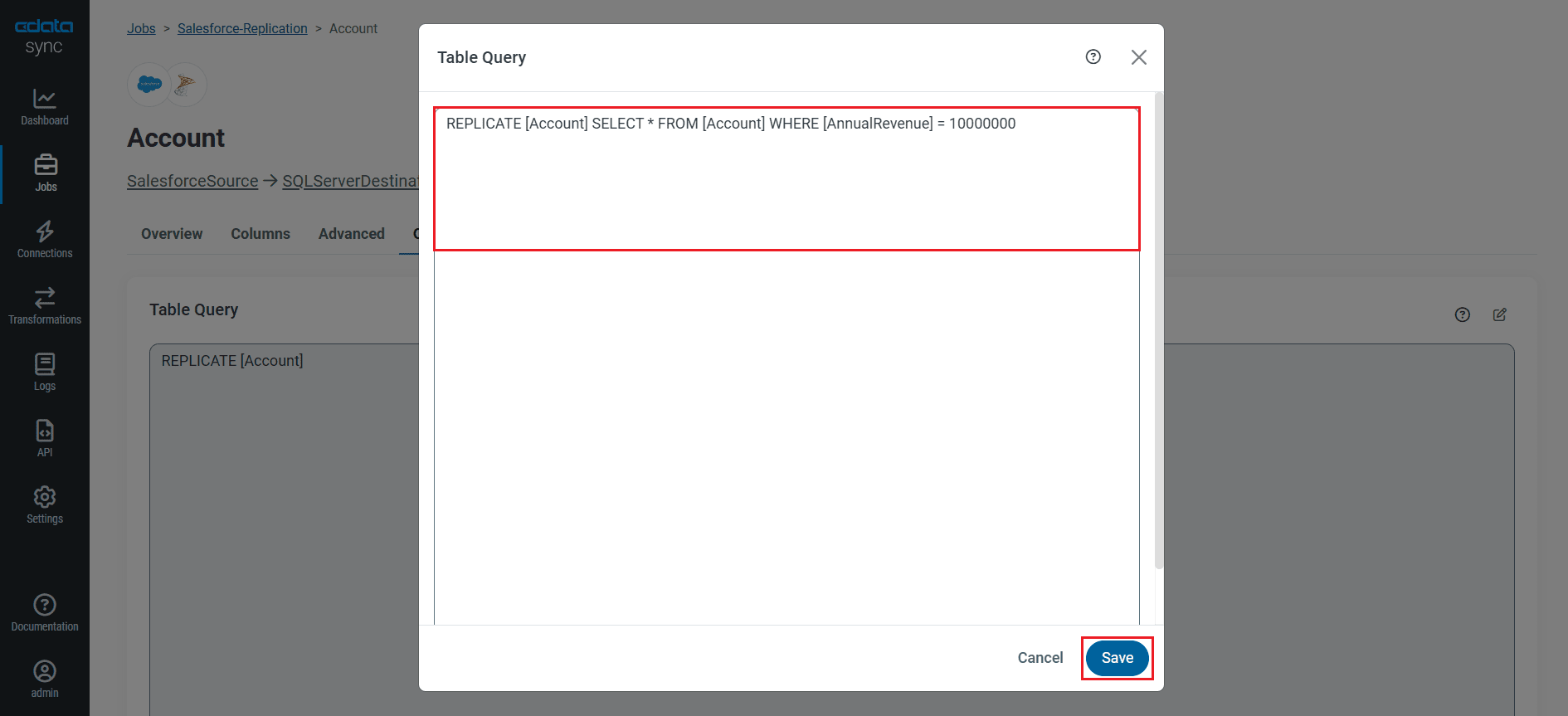 CData Sync enables you to control replication with a point-and-click interface and with SQL queries. For each replication you wish to configure, navigate to the Jobs tab and click Add Job. Select the Source and Destination for your replication.
