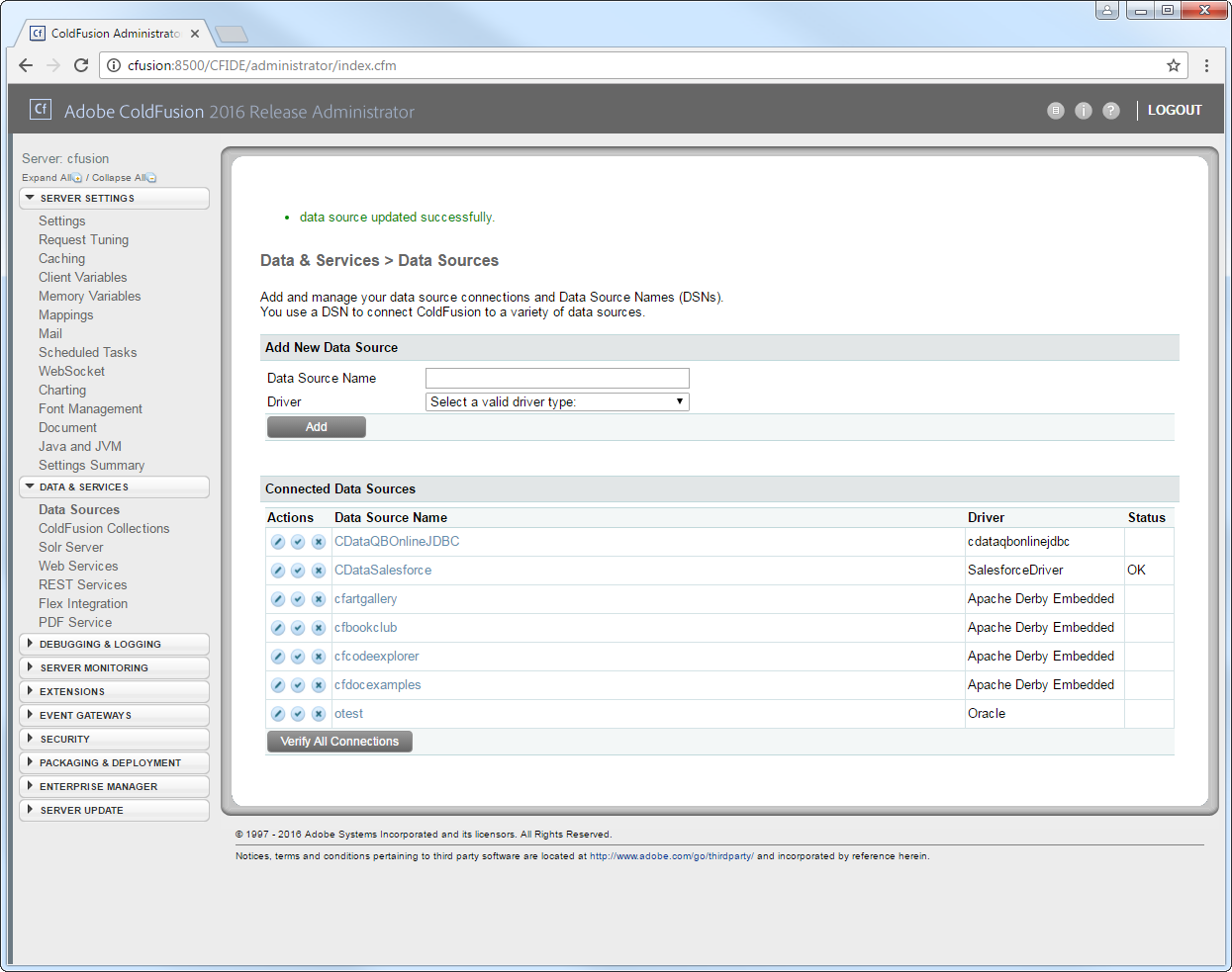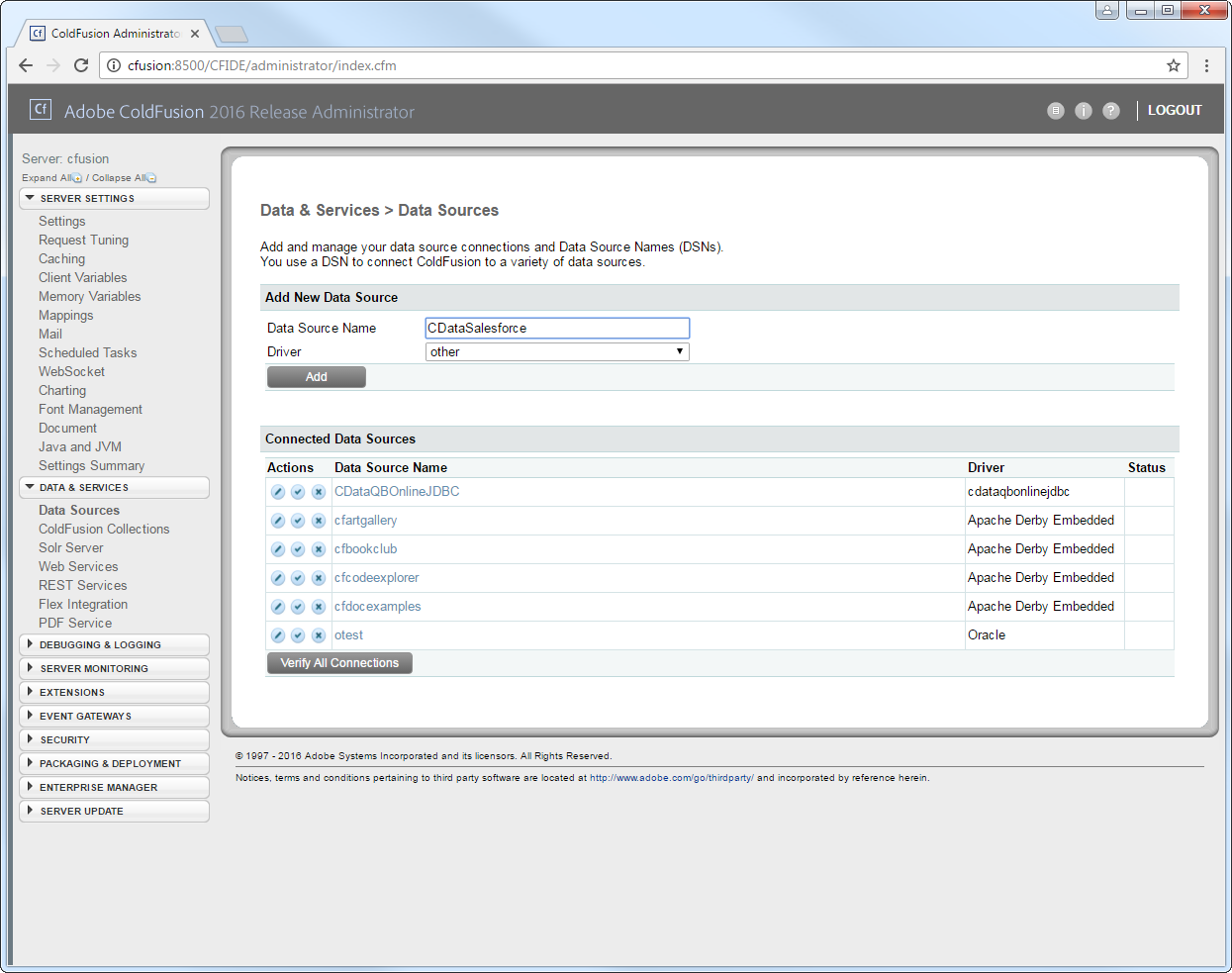 From the ColdFusion administrator interface, expand the Data & Services node and click Data Sources. In the Add New Data Source section, enter a name for the data source and select Other in the Driver menu.