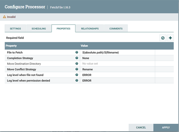 - Configure the FetchFile processor Leave the FetchFile processor's property configurations to their default values: