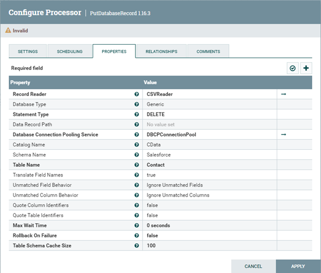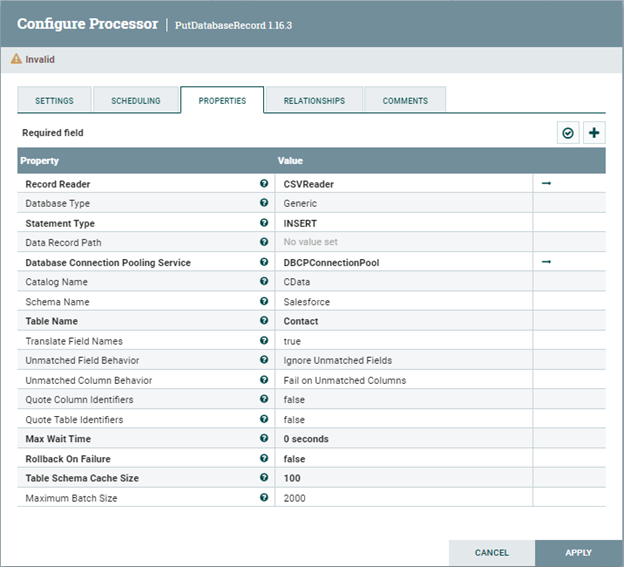 - Configure the PutDatabaseRecord processor