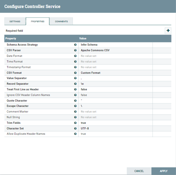 - Set the Record Reader property to a CSV Reader Controller Service. Configure the CSV Reader Controller Service to match the format of your CSV file.