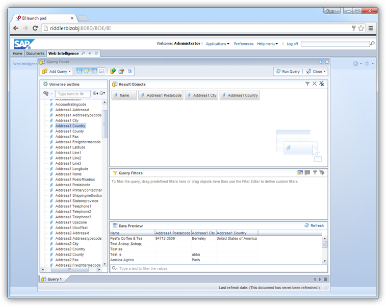 - Open Web Intelligence from the BusinessObjects launchpad and create a new document.