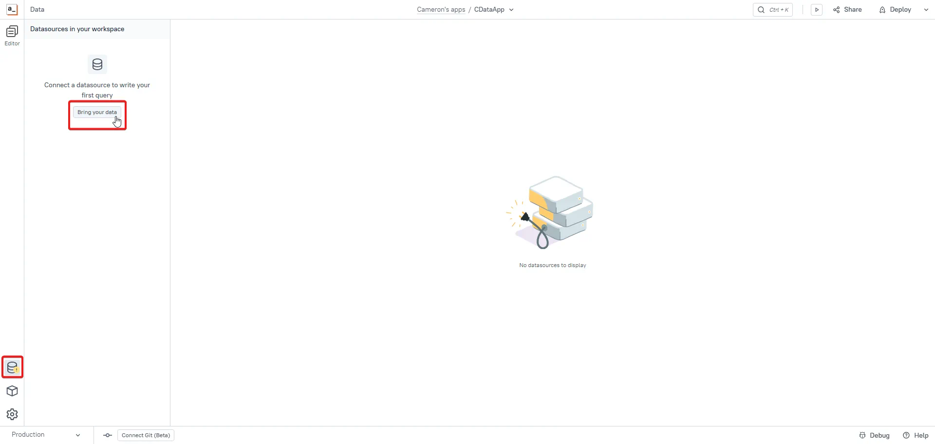 In the new application, open the Data page and select Bring your data.
