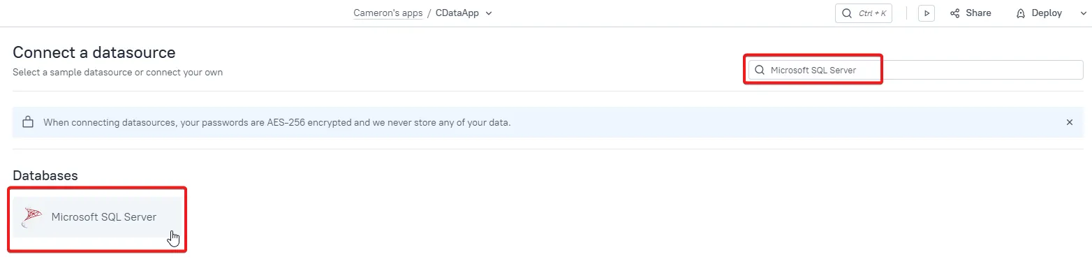 On this page, you can search for Microsoft SQL Server and select it as your data source.