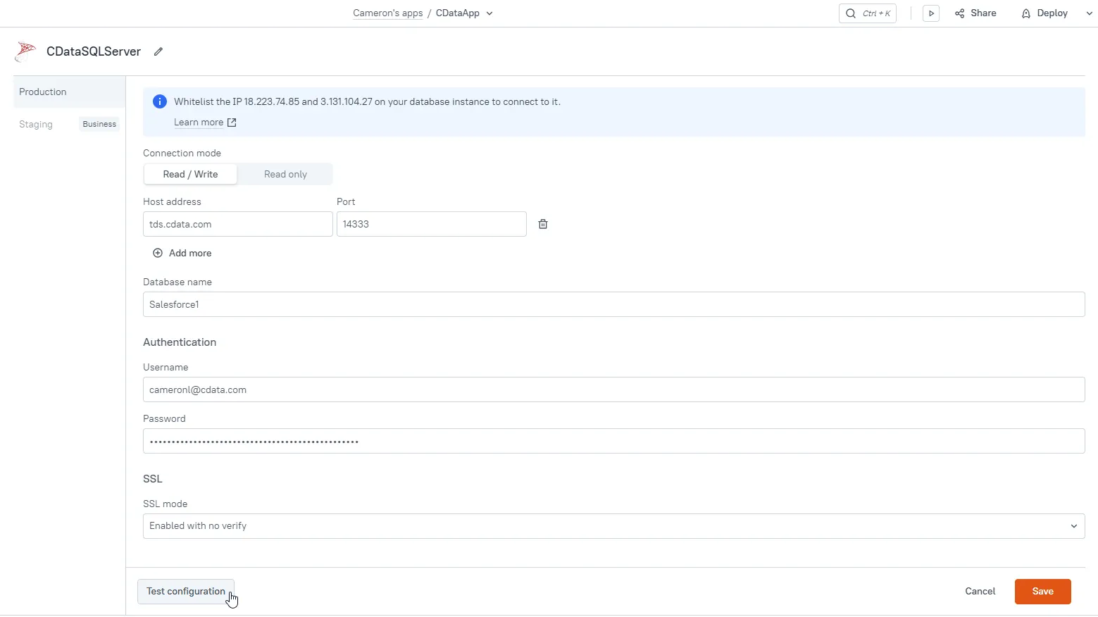 - Database name: enter the Connection Name of the CData Connect Cloud data source you want to connect to (for example, Reckon1).