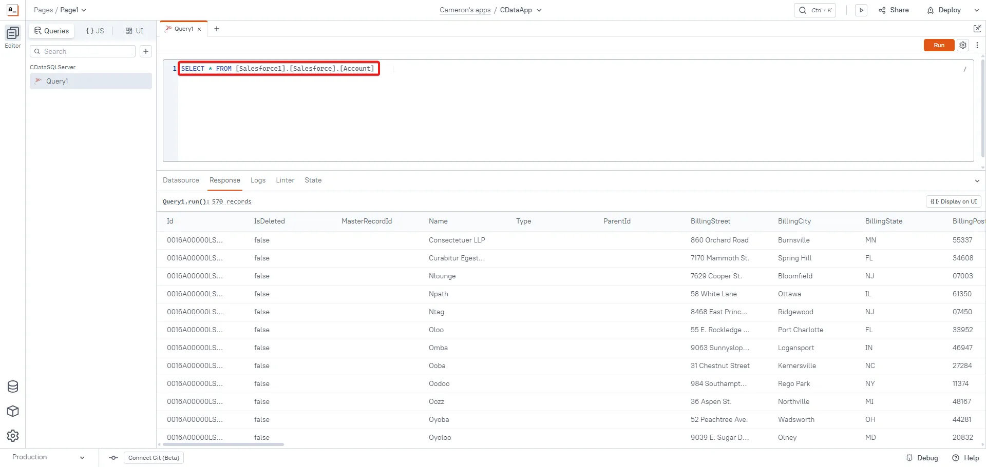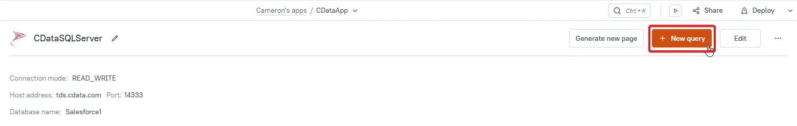 This opens the Query Editor to enter a SQL query to select data. To assist with specifying a SQL query, use the Explorer of CData Connect Cloud to preview the SQL queries and the data you want to retrieve.