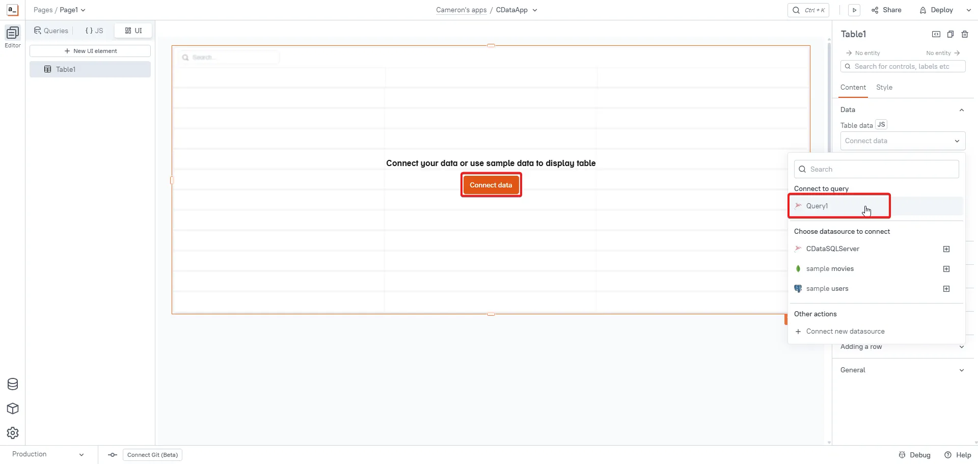 Click Connect data on the new UI element, then select the query previously created.