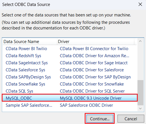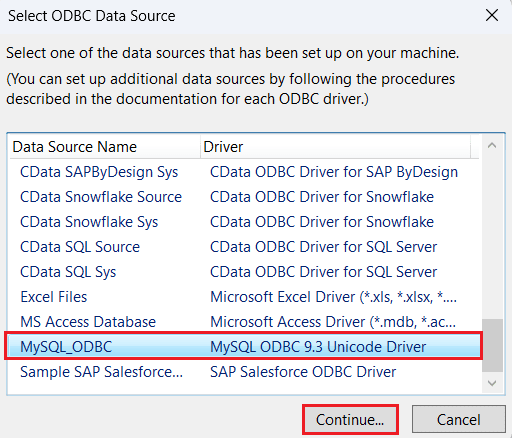 - In Select ODBC Data Source, select the previously configured MySQL ODBC driver and click Continue.